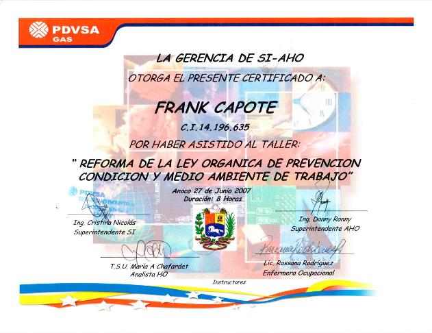 1) Curso de Higiene y Seguridad Industrial (Empresa: PDVSA GAS): Reforma de la ley orgánica de prevención condición y medio ambiente de trabajo