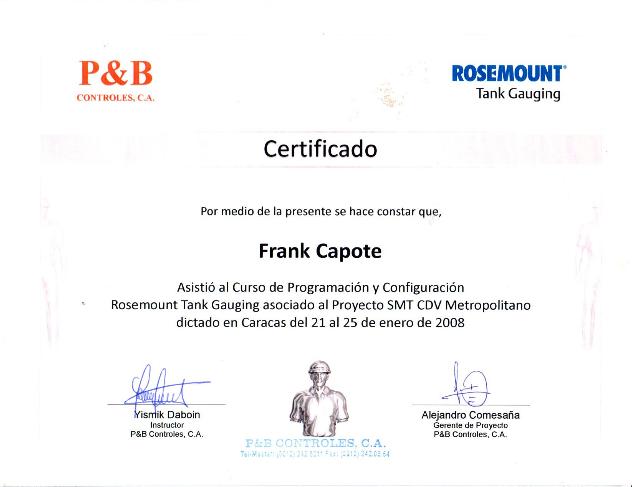 2) Curso de Programación y Configuración Rosemount Tank Gauging Asociado al Proyecto SMT CDV Metropolitano (Empresa: P&B Controles, C.A.): Manejo y configuración del software SMT para las plantas de Distribución de Combustibles del Distrito Metropolitano.