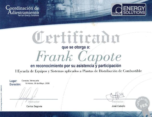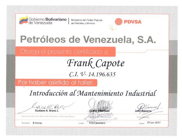 10) Inducción al Mantenimiento Industrial (Empresa: PDVSA): Mantenimiento de equipos industriales en Plantas de Distribución de Combustibles, configuraciones básicas y mantenimiento preventivo y correctivo.