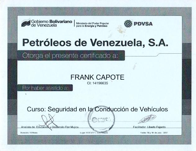 11) Seguridad en la Conducción de vehículos (Empresa: PDVSA Intevep): Teórica y Práctica del manejo de vehiculos en instalaciones PDVSA, formas de atención, reglamentos y prácticas en campo.